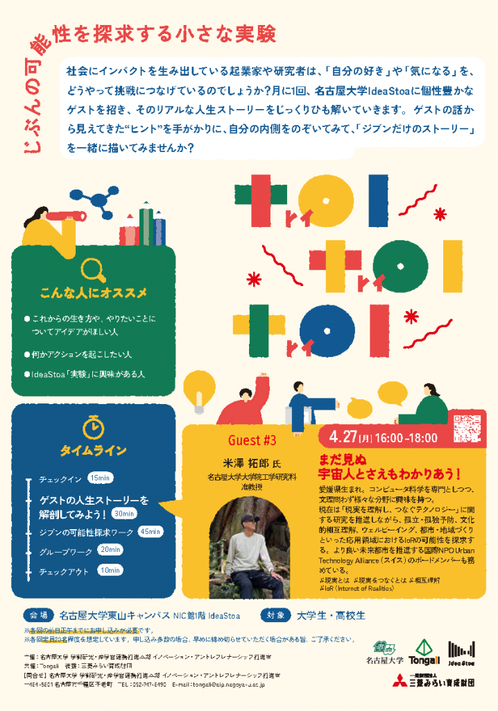 ゲストトークでは、社会にインパクトを生み出している起業家や研究者が、「自分の好き」や「気になる」をどうやって挑戦につなげているのか、そのリアルな人生ストーリーをじっくりひも解いていきましょう。