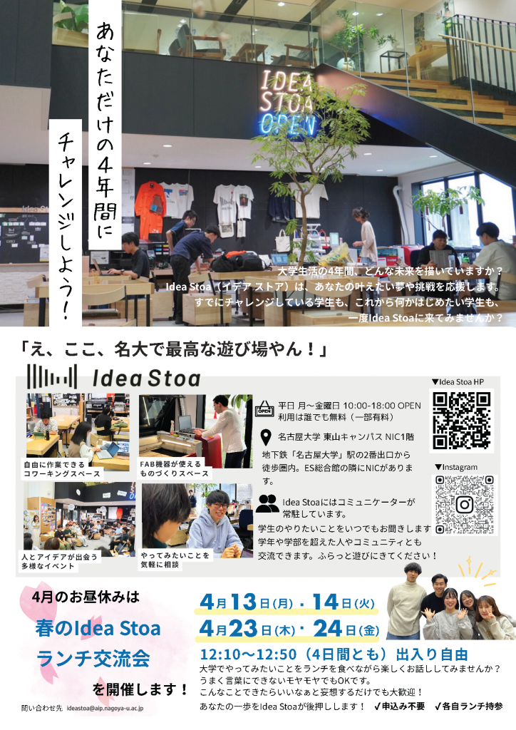 すでにチャレンジしている学生も、これから何かはじめたい学生も、一度Idea Stoaに来てみませんか?