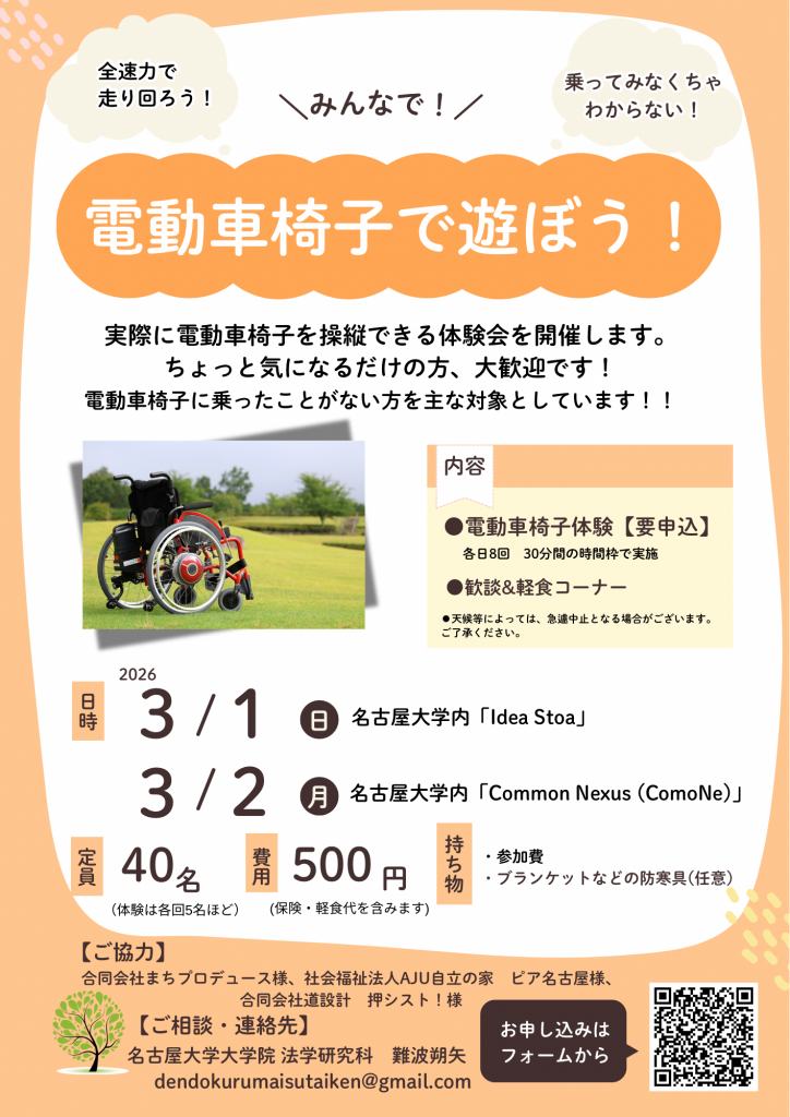 名古屋大学東山キャンパス内で、電動車椅子に自然に触れ合う機会をつくる実験プロジェクトです!  「支援」や「理解」にとどまらず、電動車椅子をひとつの移動手段・乗りものとして体験してもらうことで、車椅子との距離感や見え方が変わるきっかけを提供します。