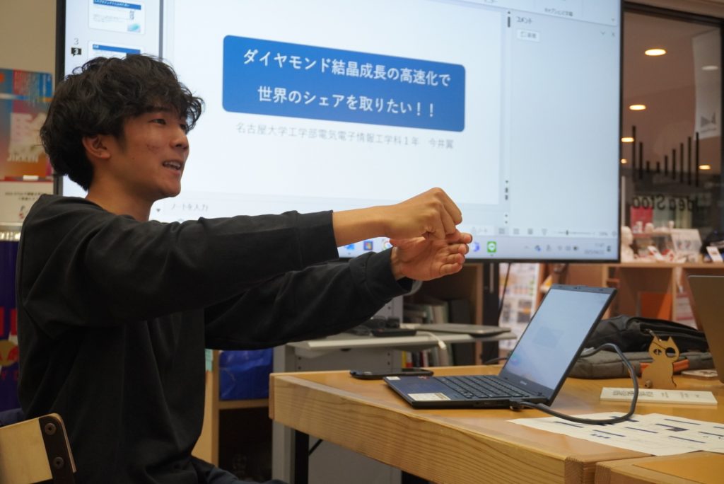 Idea Stoaのチームメンバー(URAや学生コミュニケーター)とともにミーティングを重ねながら、今井さん自身が「なぜ人工ダイヤモンドに惹かれるのか」を改めて振り返り、プロジェクトとしてどこを目指すのかを議論しました。