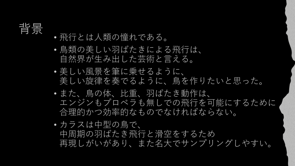 自然界が生み出した鳥の羽ばたきの芸術性に触発され、美しい風景や旋律を描くような感覚で飛行表現を再現していきたいと考えています。