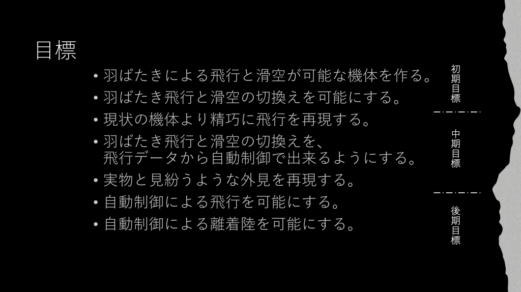 初期段階では、羽ばたきと滑空を切り替えられる機体を作ることを目指します。